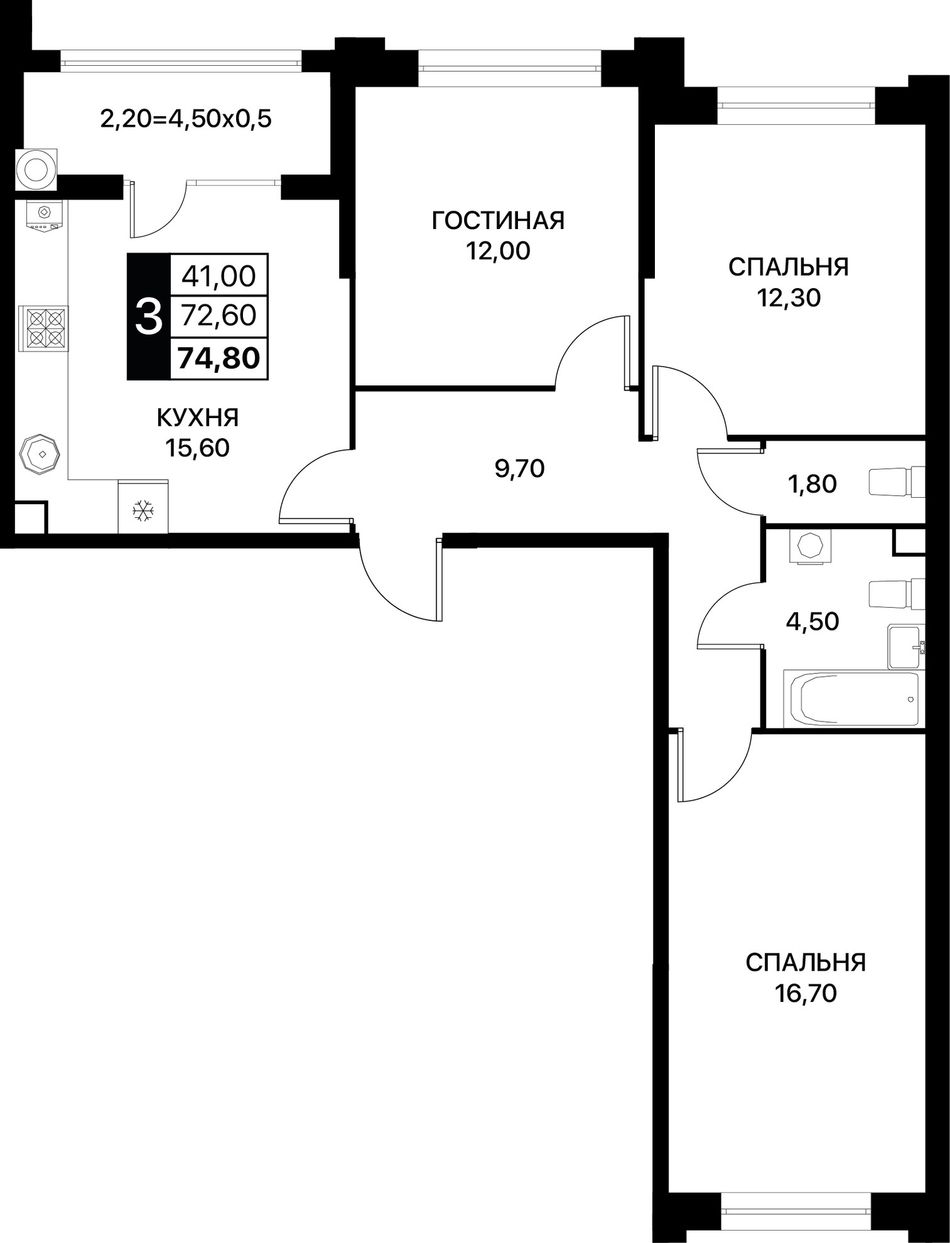 3-комнатная — 74,8 м² 2/12 эт. в Сияние