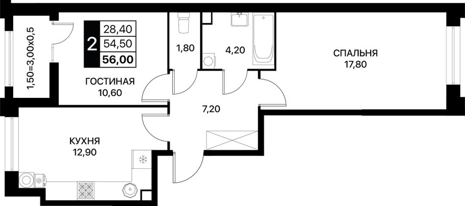 2-комнатная — 56 м² 2/12 эт. в Сияние
