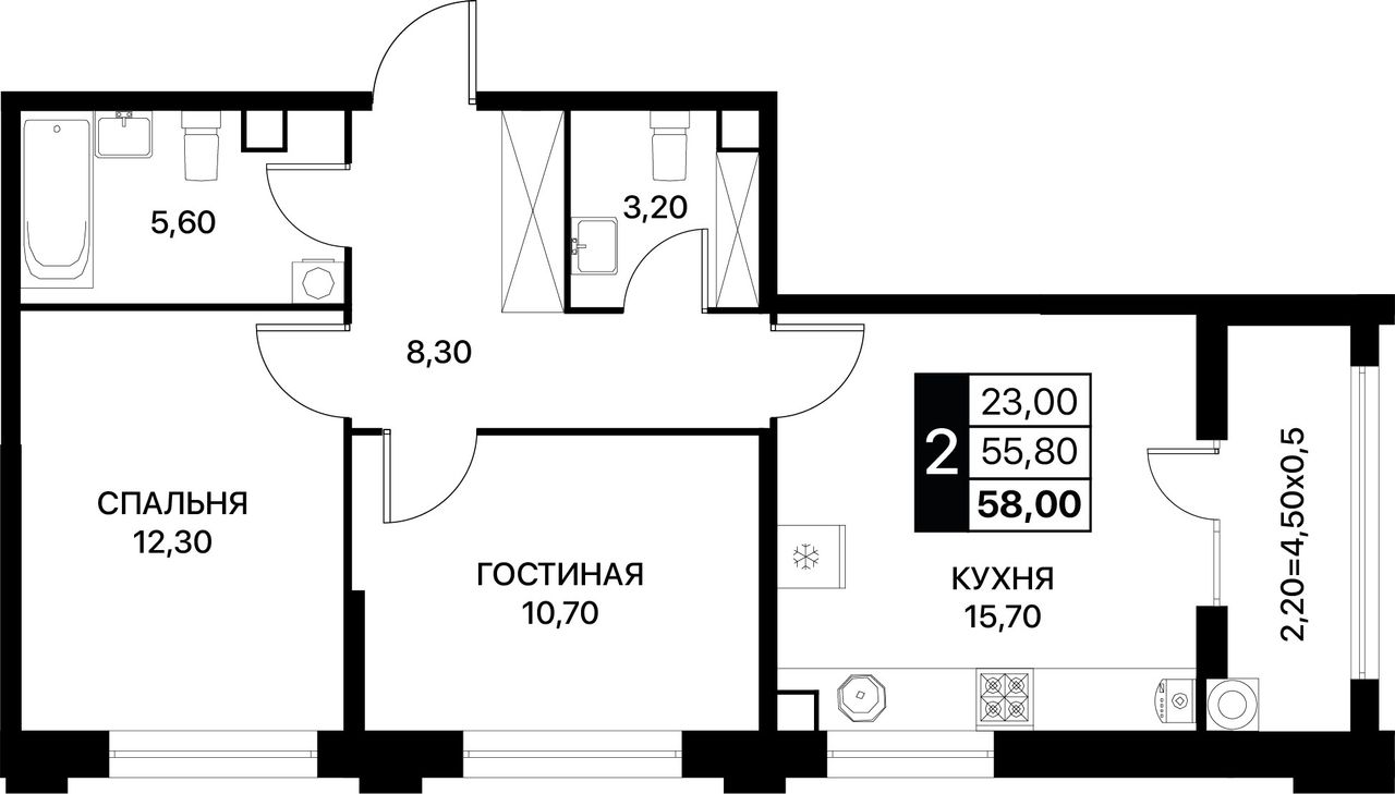 2-комнатная — 58 м² 2/12 эт. в Сияние