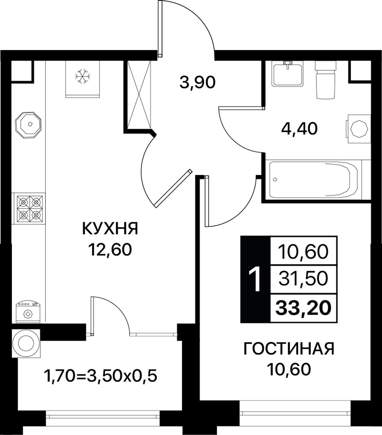 1-комнатная — 33,2 м² 2/12 эт. в Сияние