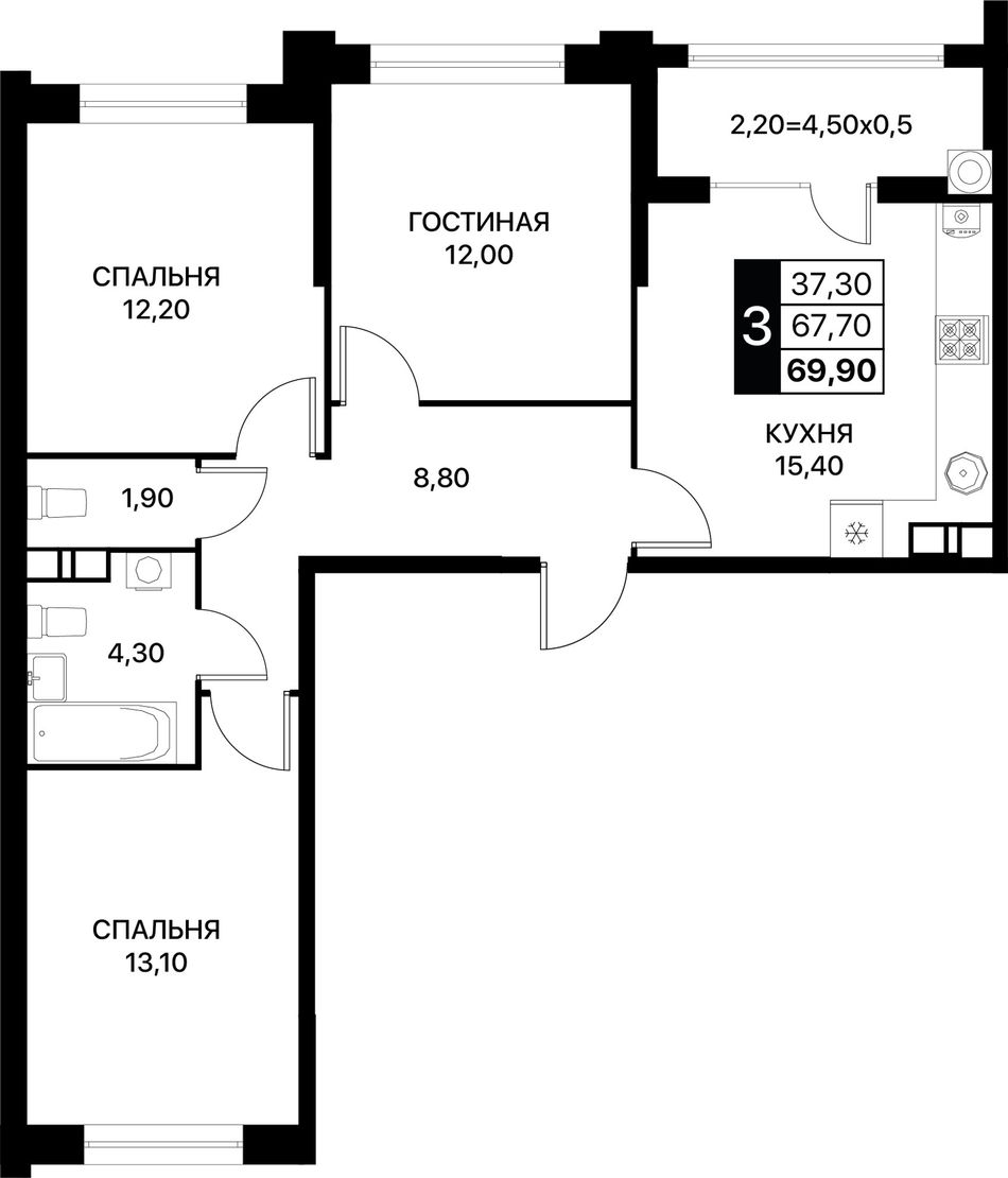 3-комнатная — 69,9 м² 8/12 эт. в Сияние