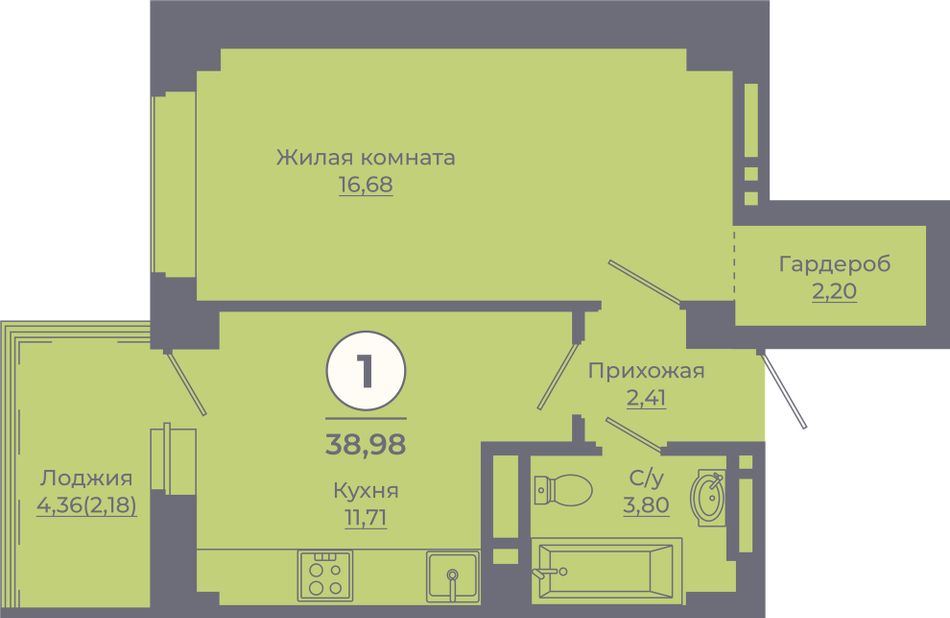 1-комнатная — 38,79 м² 15/24 эт. в Сокольники