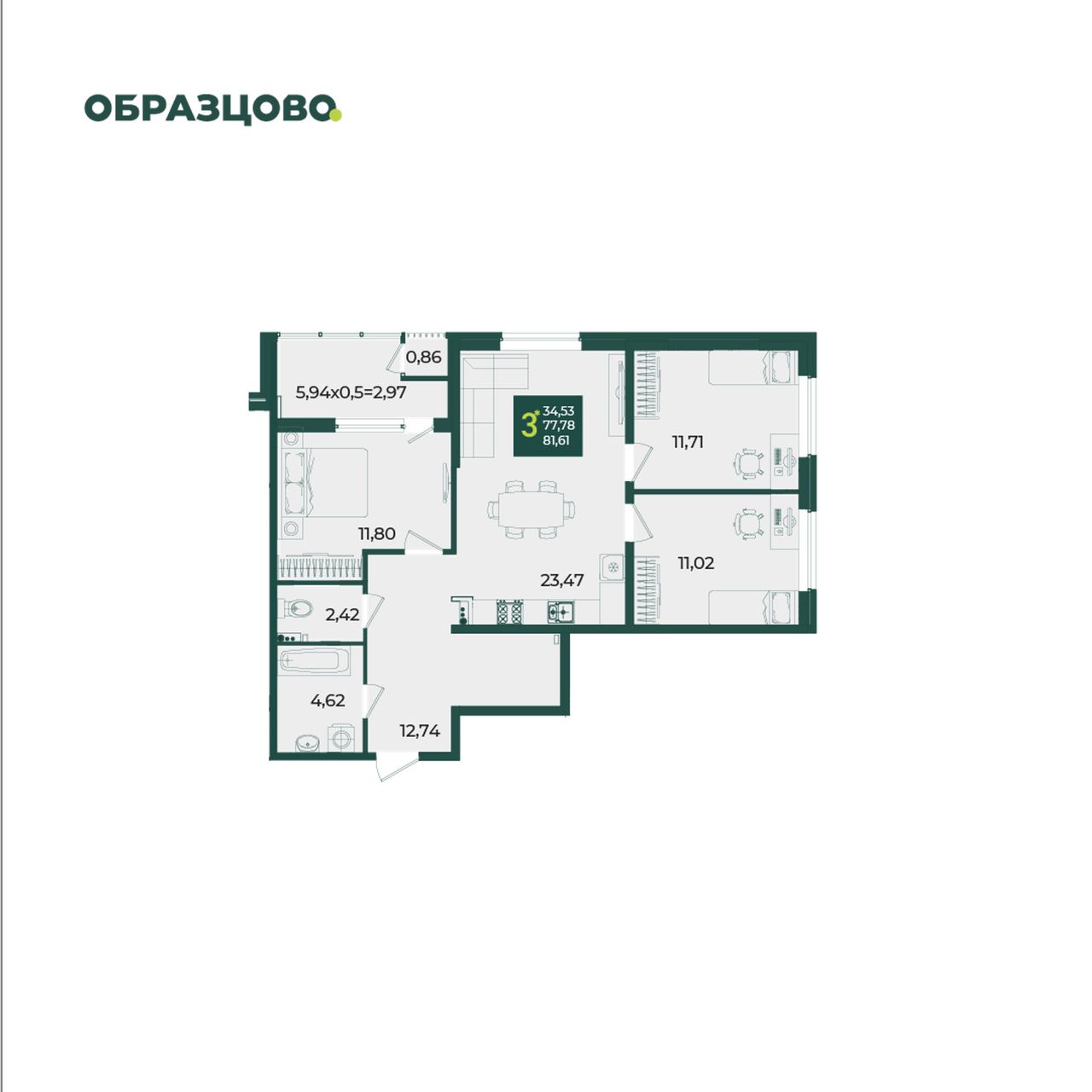 3-комнатная — 81,61 м² 3/18 эт. в Образцово