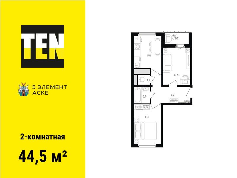 2-комнатная — 44,5 м² 8/16 эт. в 5 элемент Аске