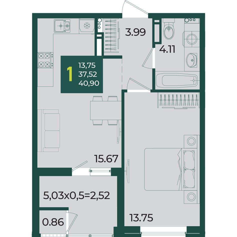 Общая площадь40,9 м²