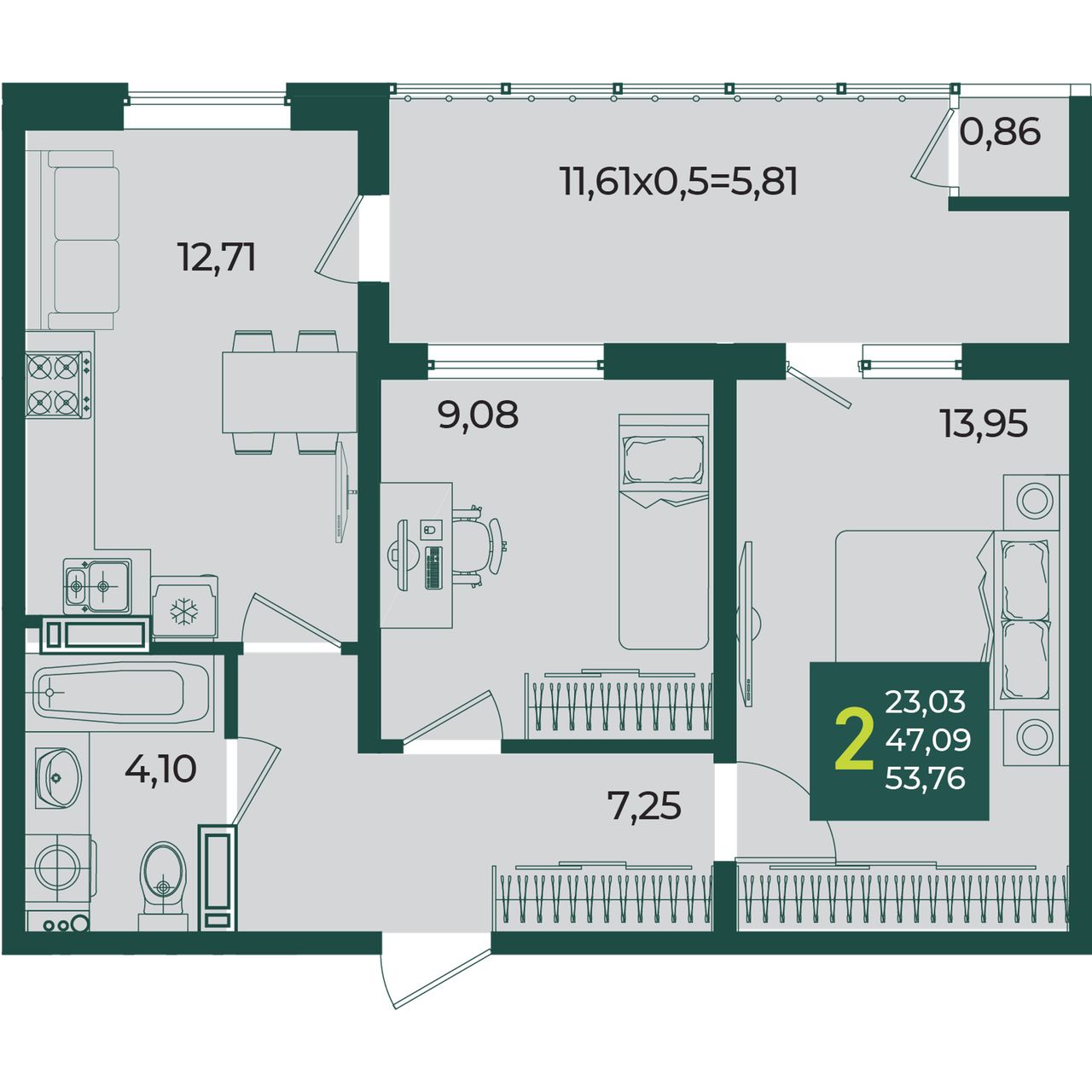 Общая площадь53,76 м²