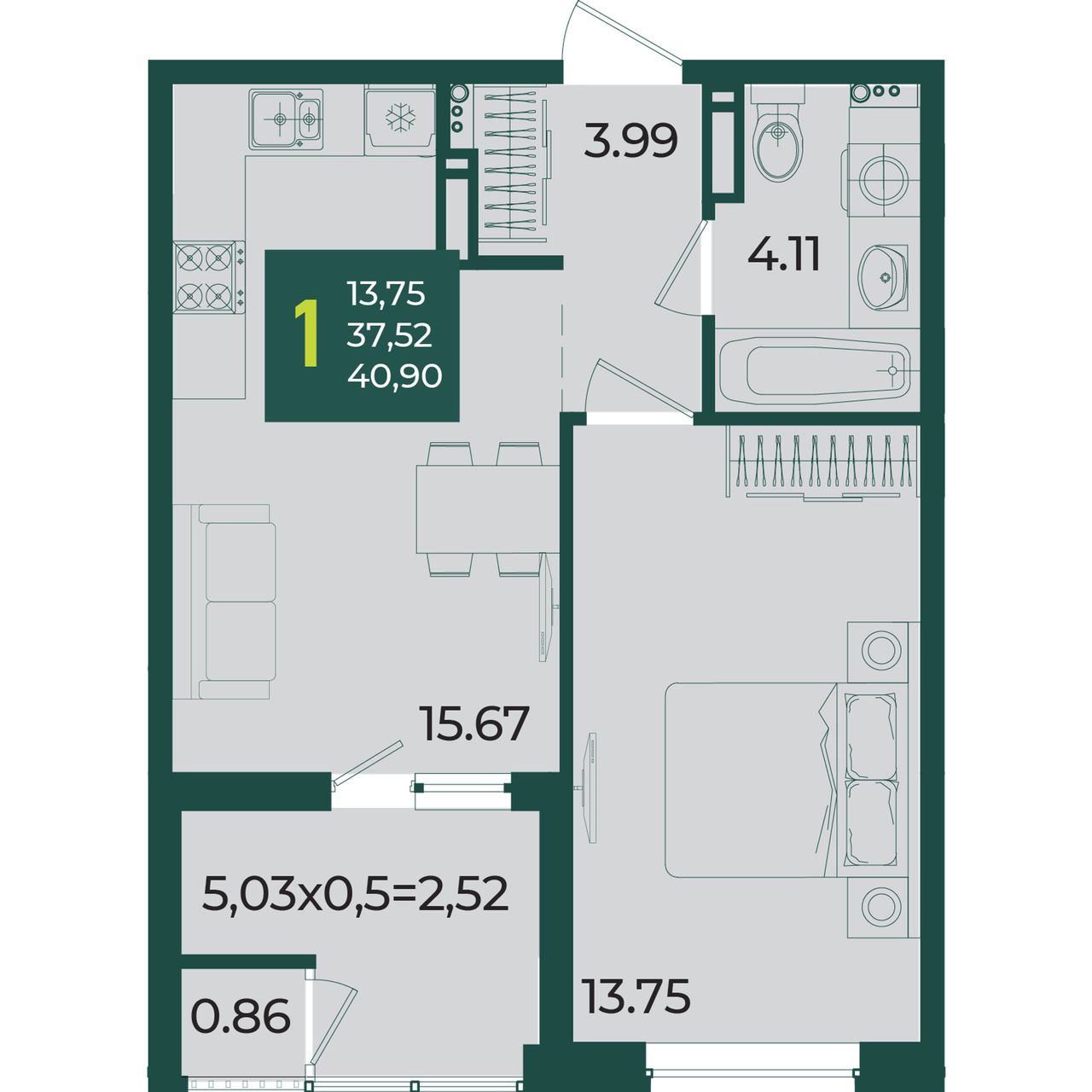 3. 1-комнатная, 40,9 м²