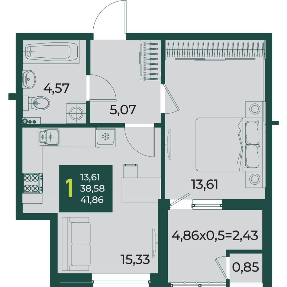 1-комнатная — 41,86 м² 2/18 эт. в Образцово