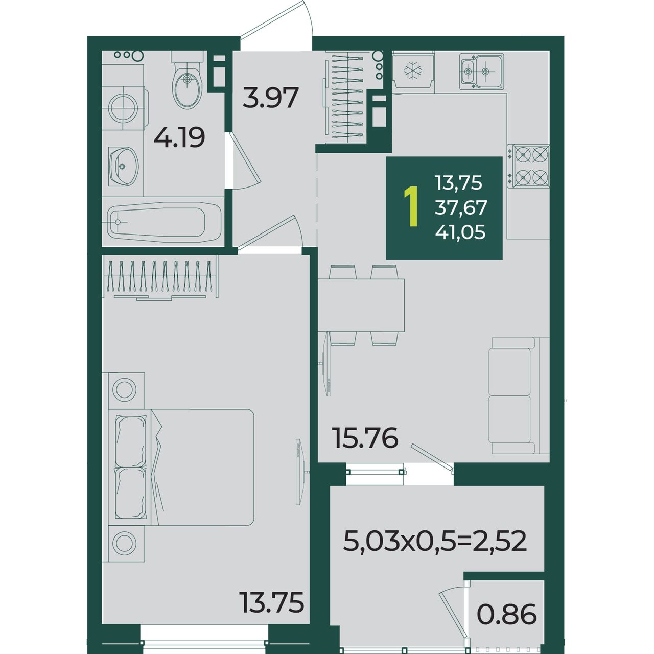 1-комнатная — 41,05 м² 8/18 эт. в Образцово
