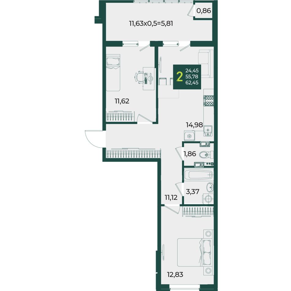 Общая площадь62,45 м²