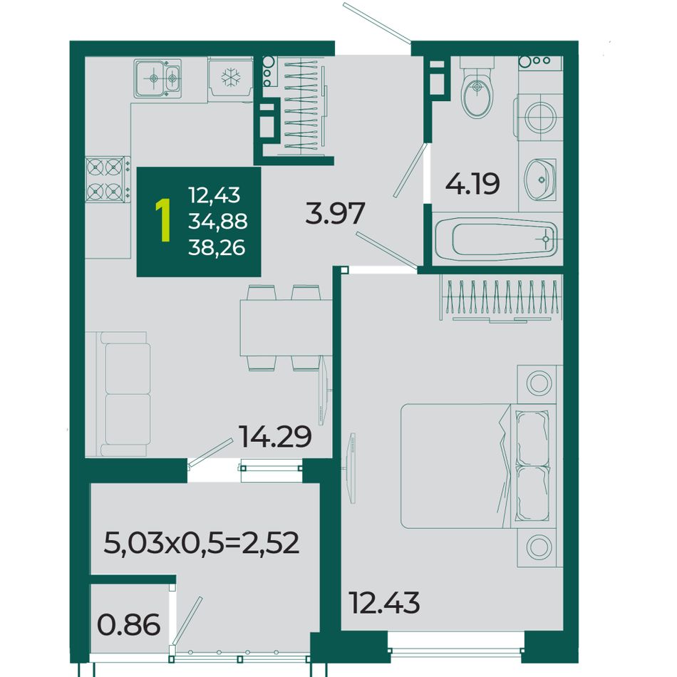 3. 1-комнатная, 38,26 м²
