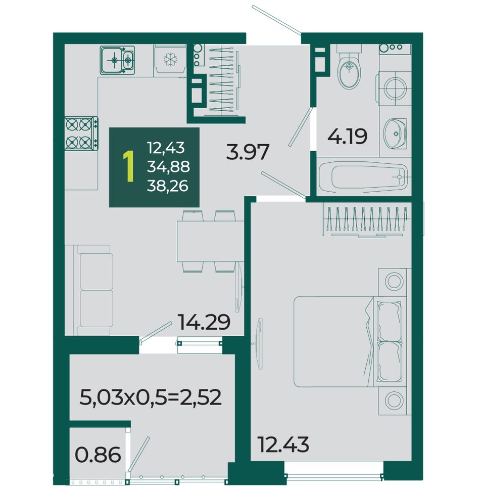 1-комнатная — 38,26 м² 4/18 эт. в Образцово