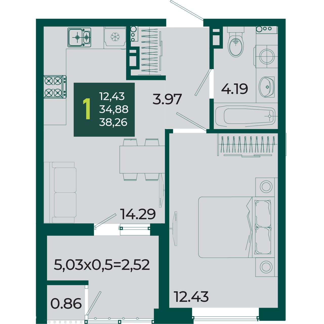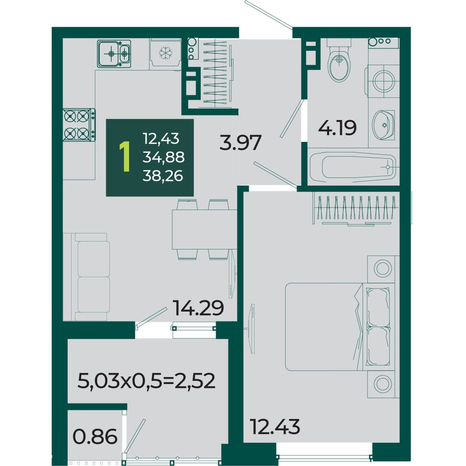 Общая площадь38,26 м²