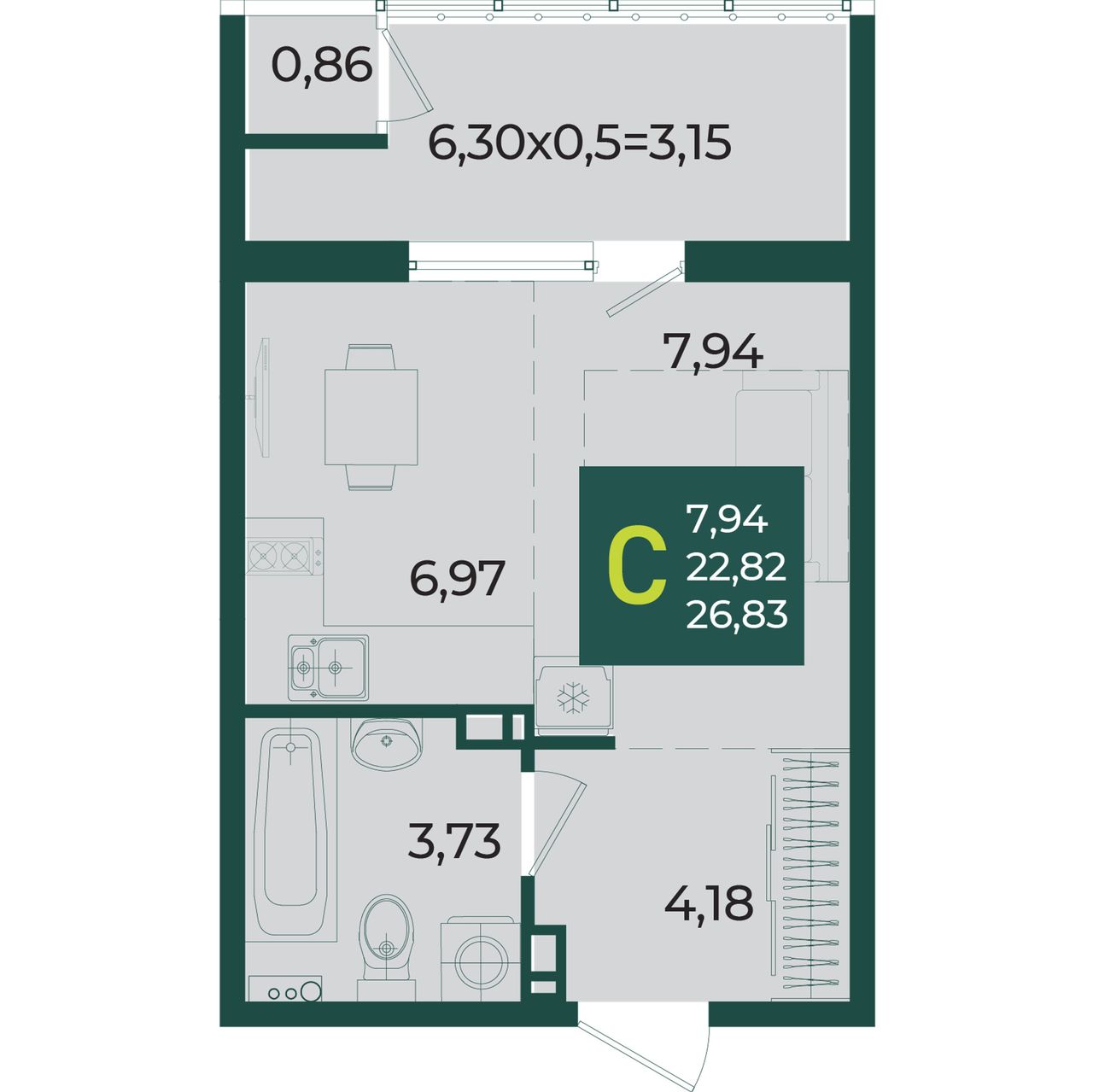 Общая площадь26,83 м²