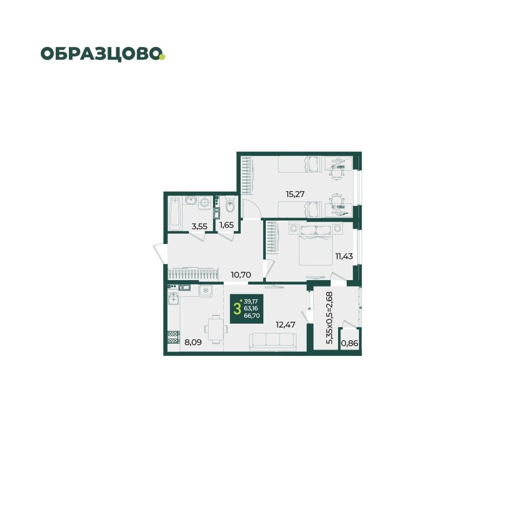 3-комнатная — 66,7 м² 3/18 эт. в Образцово