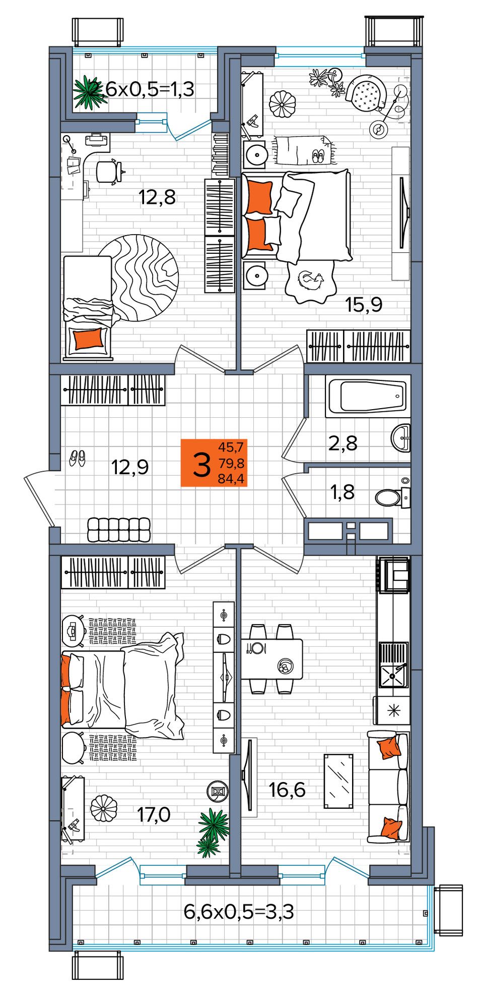 3-комнатная — 84,4 м² 15/16 эт. в Сармат