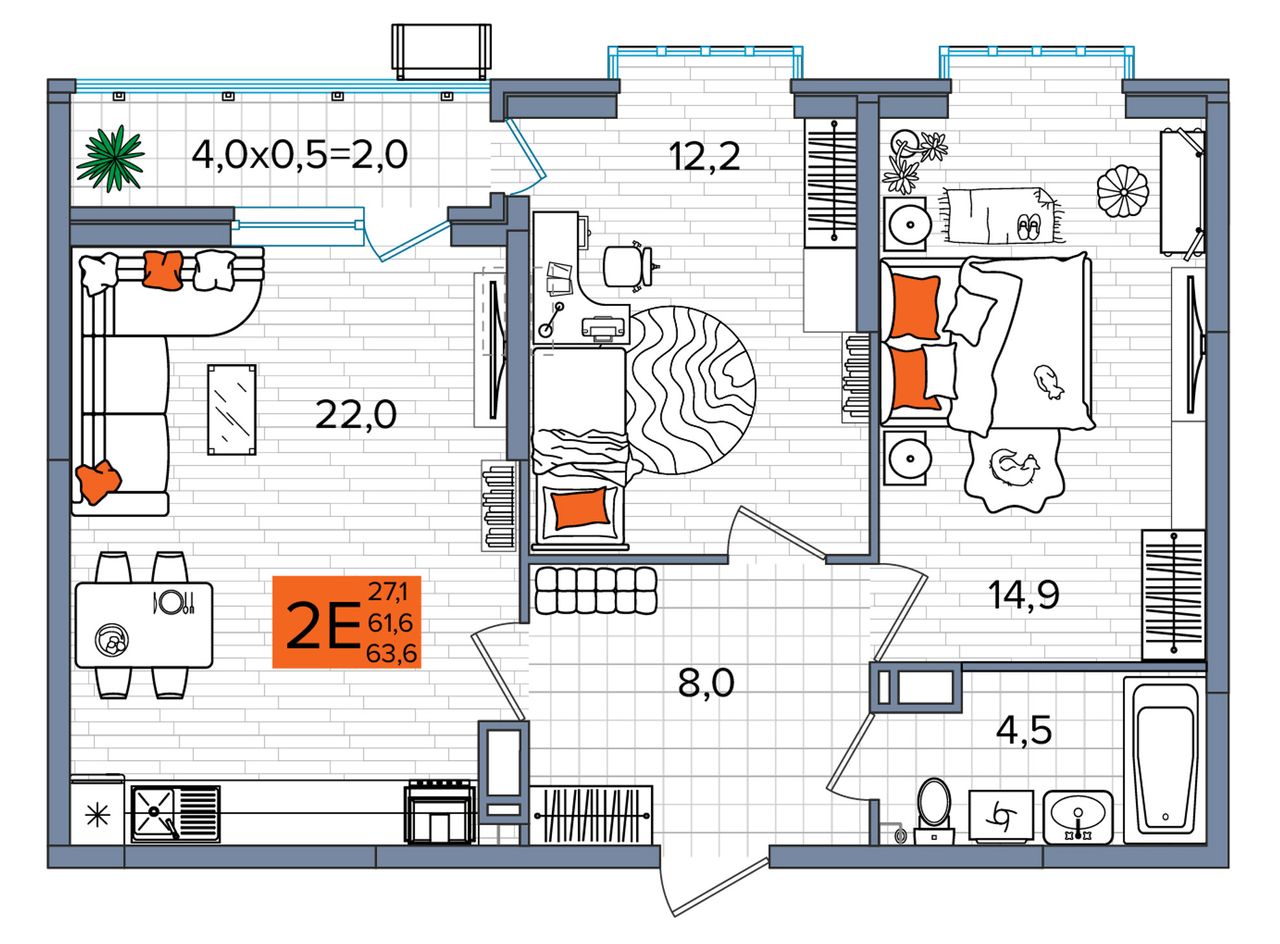 2-комнатная — 63,6 м² 16/16 эт. в Сармат