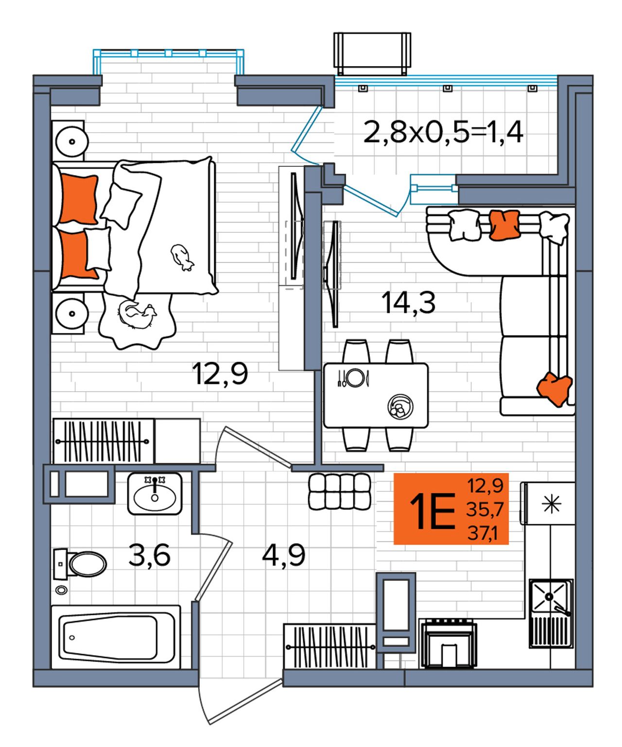 1-комнатная — 37,1 м² 16/16 эт. в Сармат