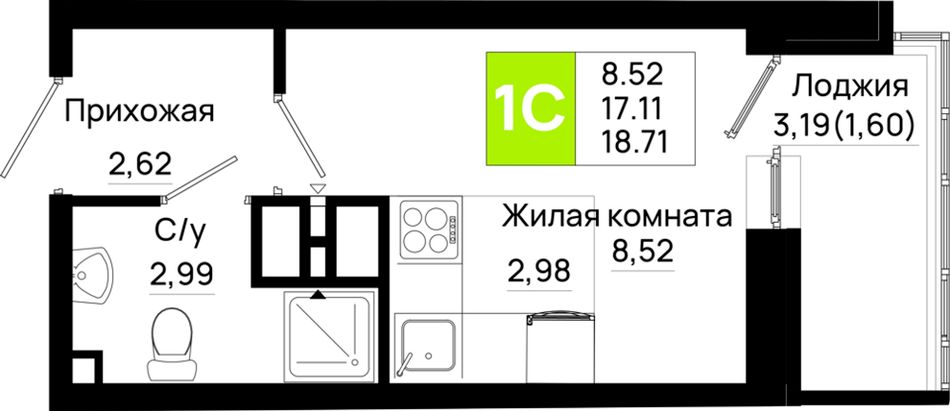 Студия — 18,71 м² 16/25 эт. в Октябрь Парк
