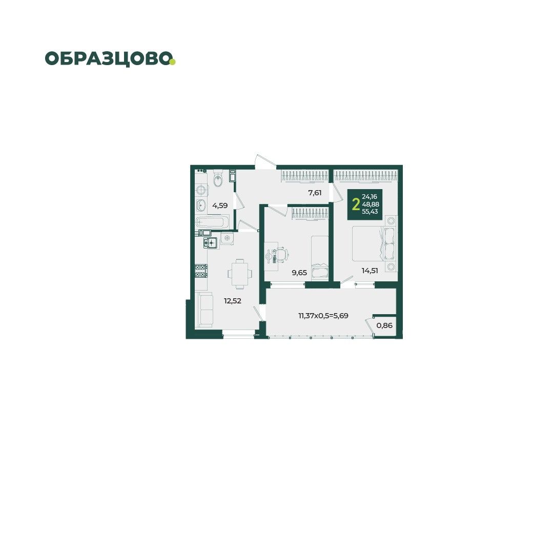 2-комнатная — 55,43 м² 4/18 эт. в Образцово