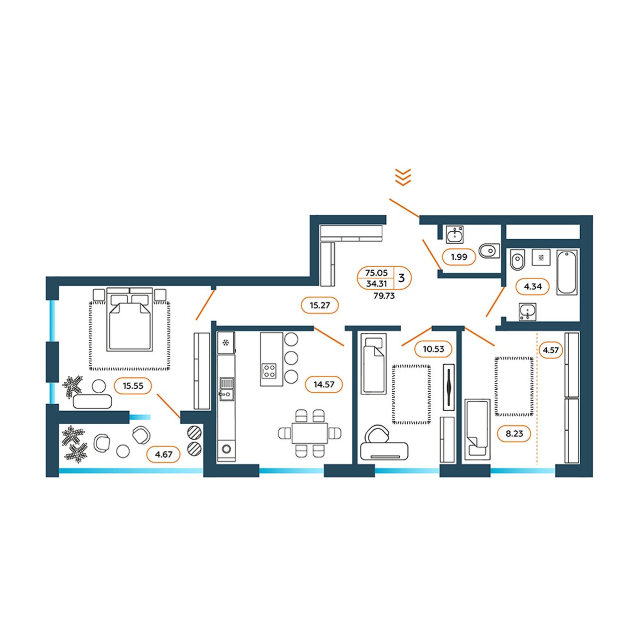 3-комнатная — 81,2 м² 9/13 эт. в Пульс