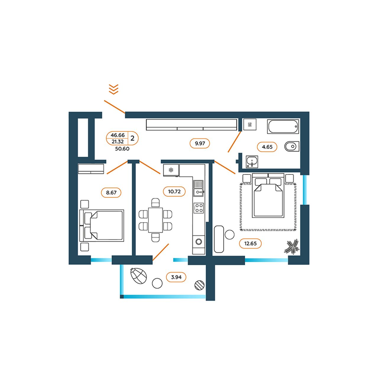 2-комнатная — 50,3 м² 13/13 эт. в Пульс