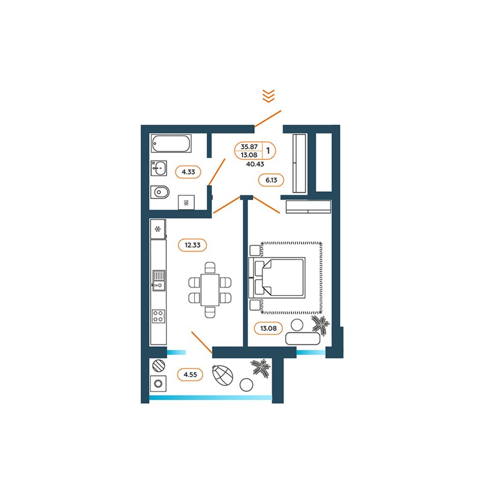 1-комнатная — 41,4 м² 4/11 эт. в Пульс
