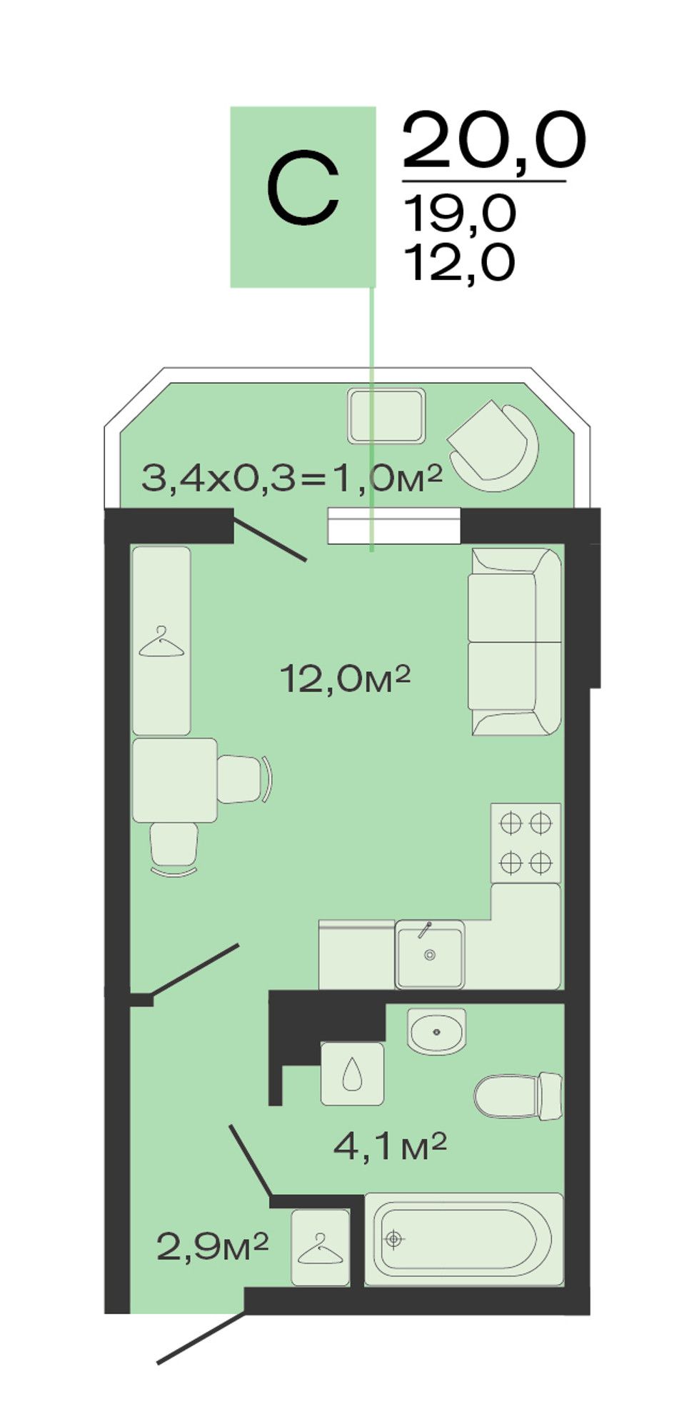 Студия — 20 м² 1/4 эт. в Дзенпарк