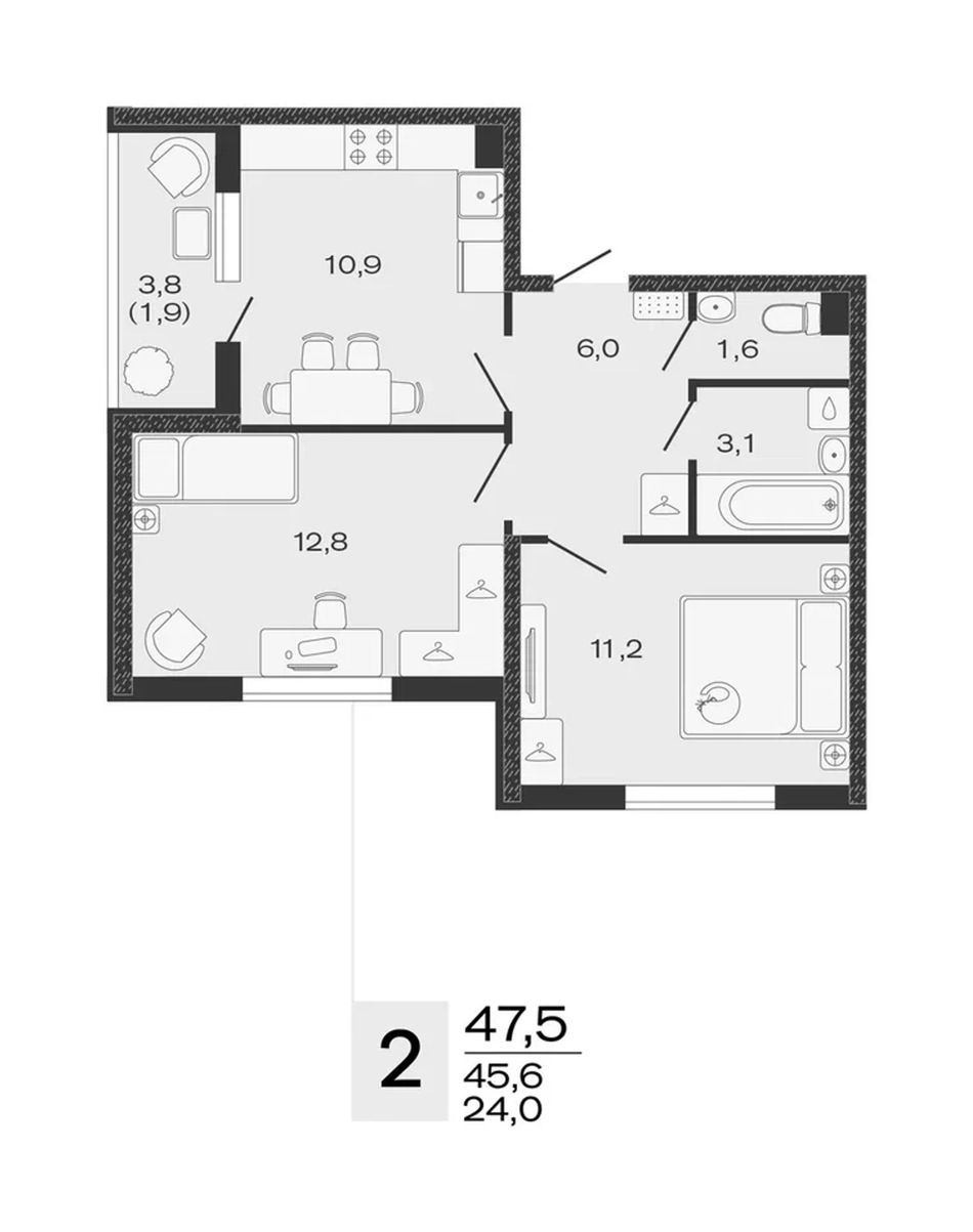 2-комнатная — 47,5 м² 2/4 эт. в Дзенпарк