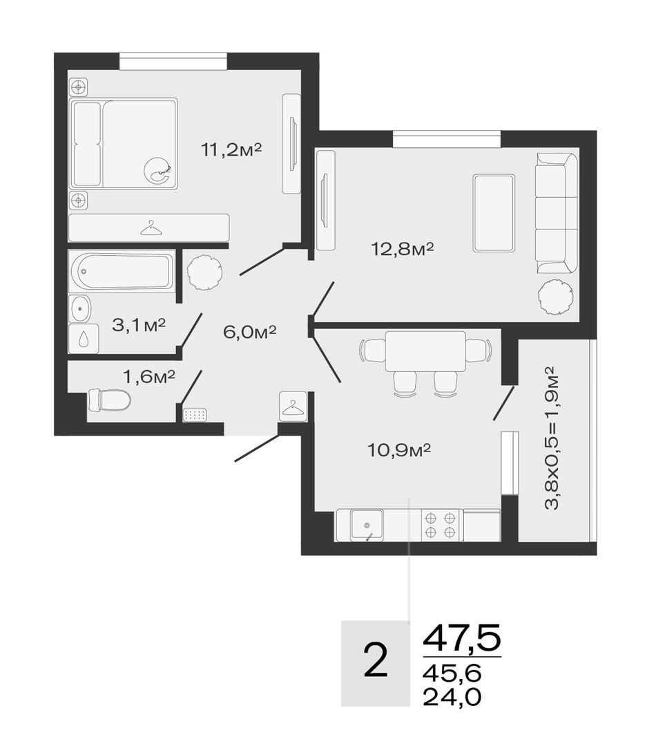 2-комнатная — 47,5 м² 2/4 эт. в Дзенпарк