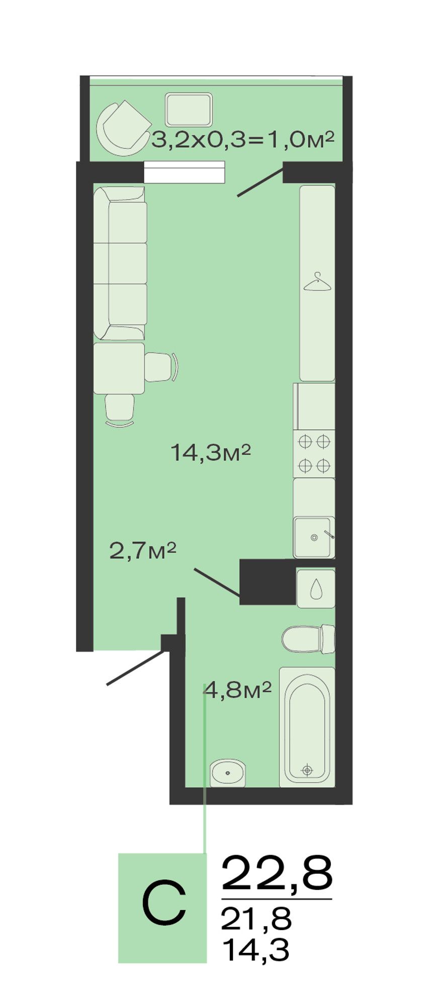 Студия — 22,8 м² 4/4 эт. в Дзенпарк