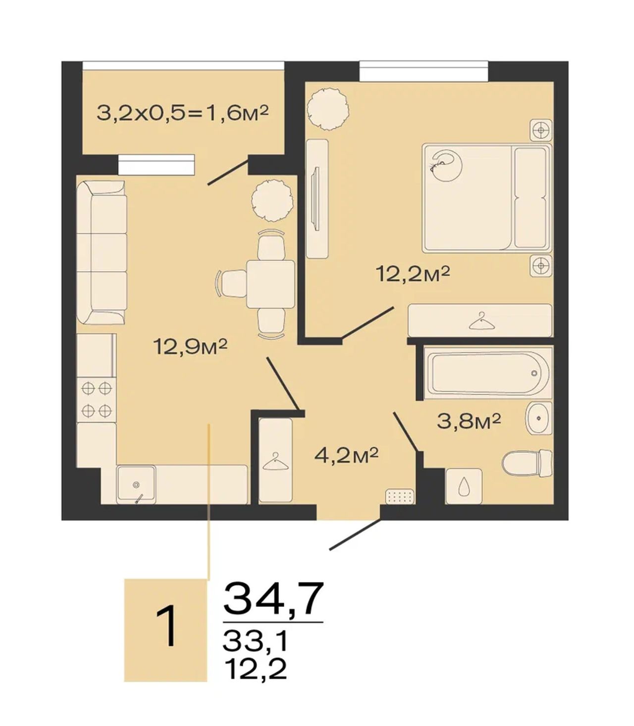 1-комнатная — 34,7 м² 3/4 эт. в Дзенпарк