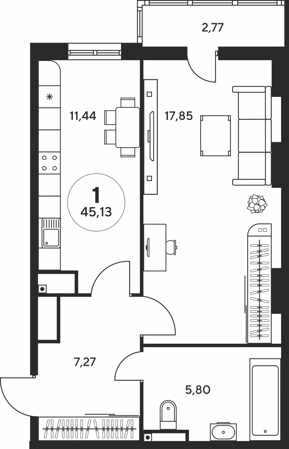 1-комнатная — 45,06 м² 17/25 эт. в Соколова, 68