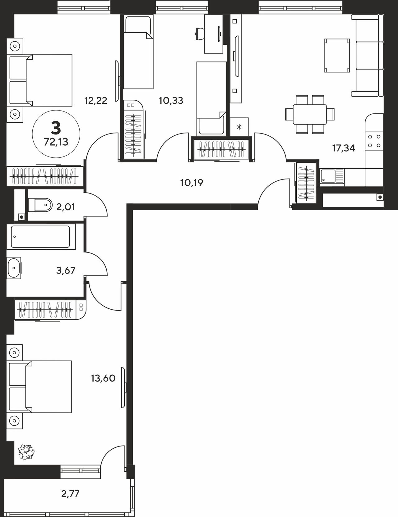 3-комнатная — 72,13 м² 23/0 эт. в Соколова, 68