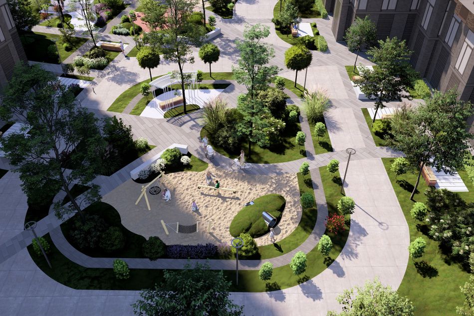 Серо-белые вентилируемые фасады, приватная территория с ландшафтным дизайном, детский сад, торговая галерея, большой подземный и наземный па...