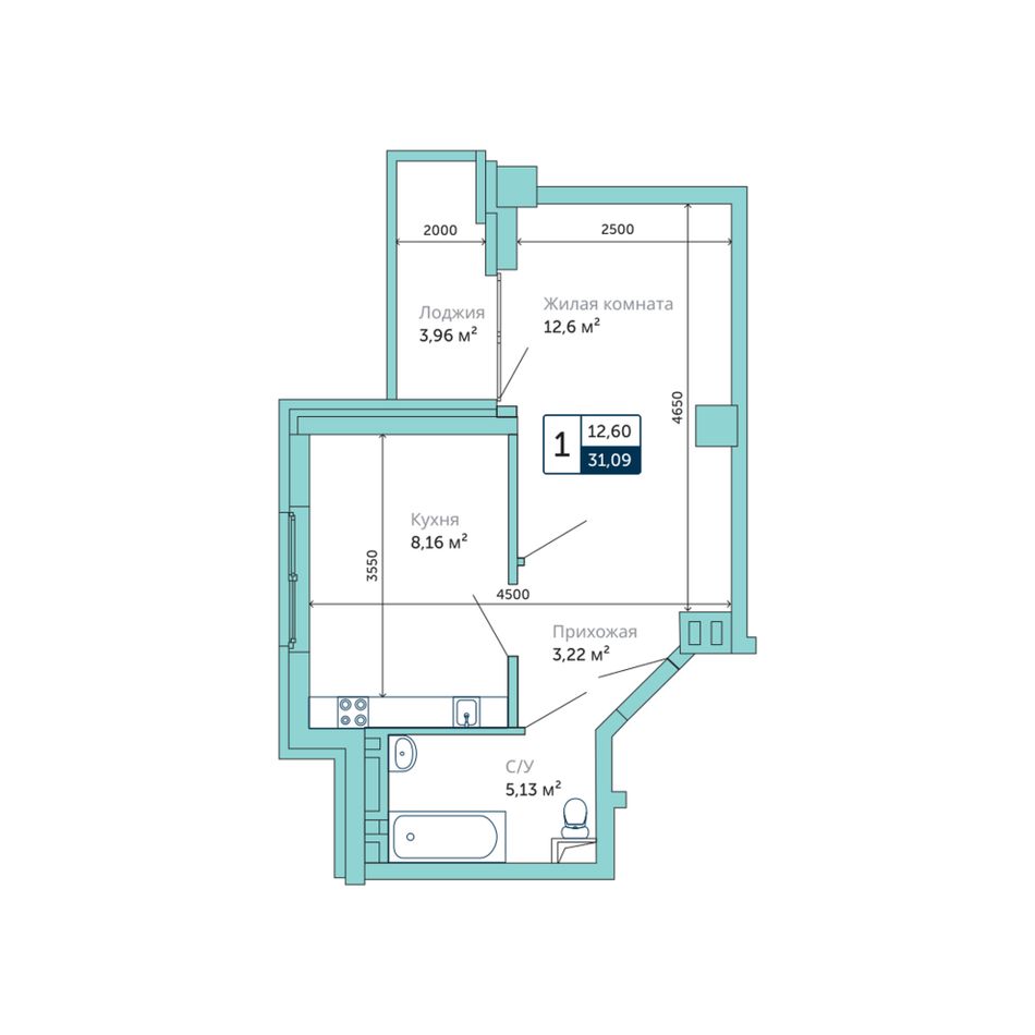 1-комнатная квартира №111 в ЖК «Семейный» площадью 31.09 м2 расположенная на 5 этаже.