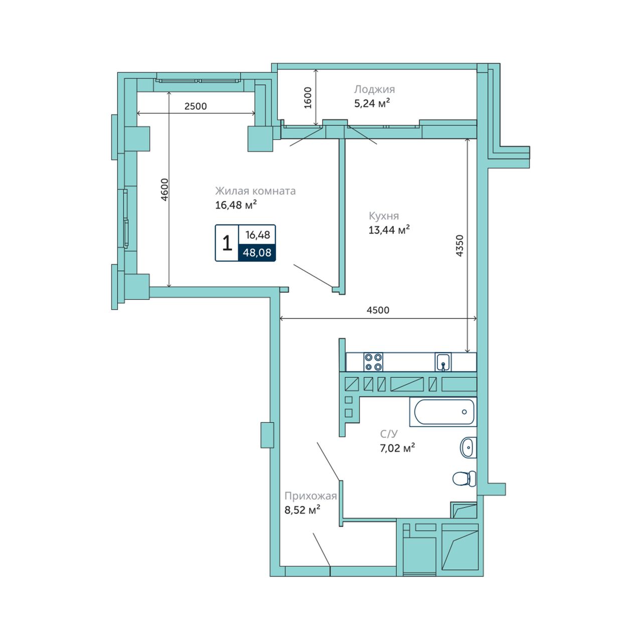 1-комнатная квартира №126 в ЖК «Семейный» площадью 48.08 м2 расположенная на 7 этаже.