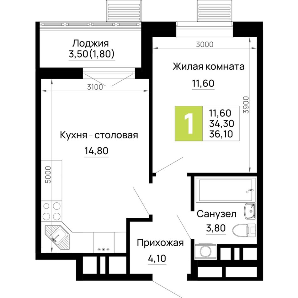 1-комнатная — 36,1 м² 1/16 эт. в Дом 101