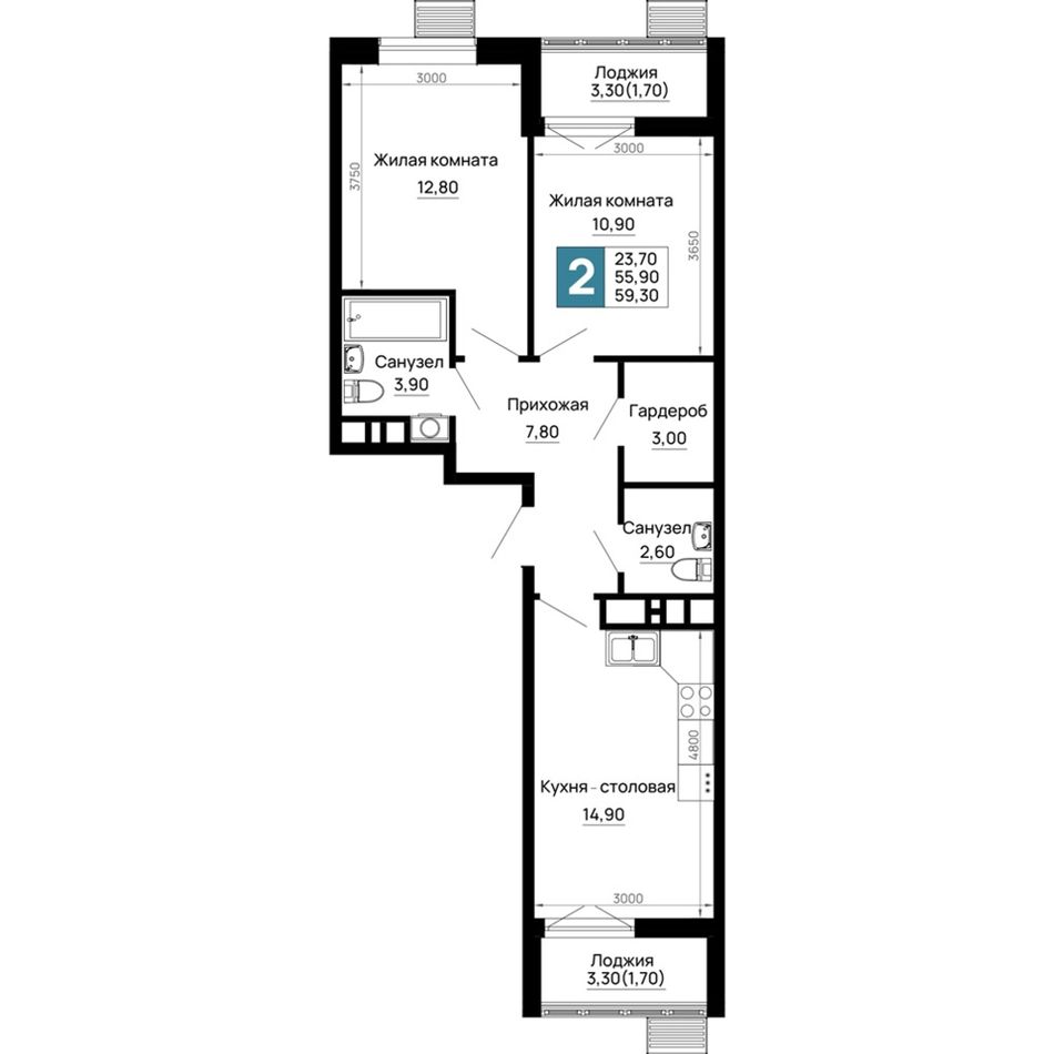 Общая площадь59,3 м²