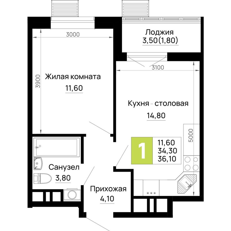 1-комнатная — 36,1 м² 1/16 эт. в Дом 101