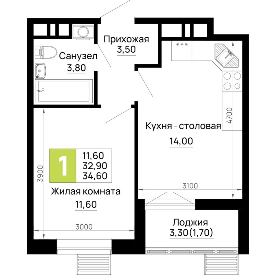 1-комнатная — 34,6 м² 1/16 эт. в Дом 101