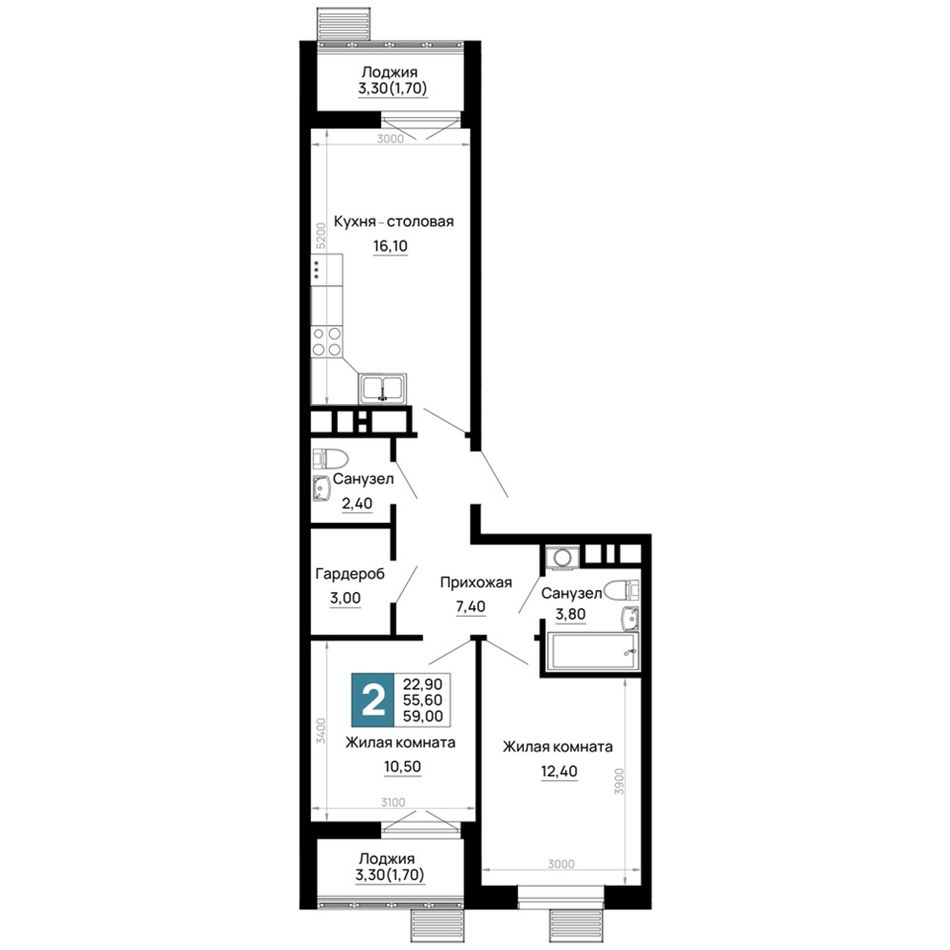 2-комнатная — 59 м² 5/16 эт. в Дом 101