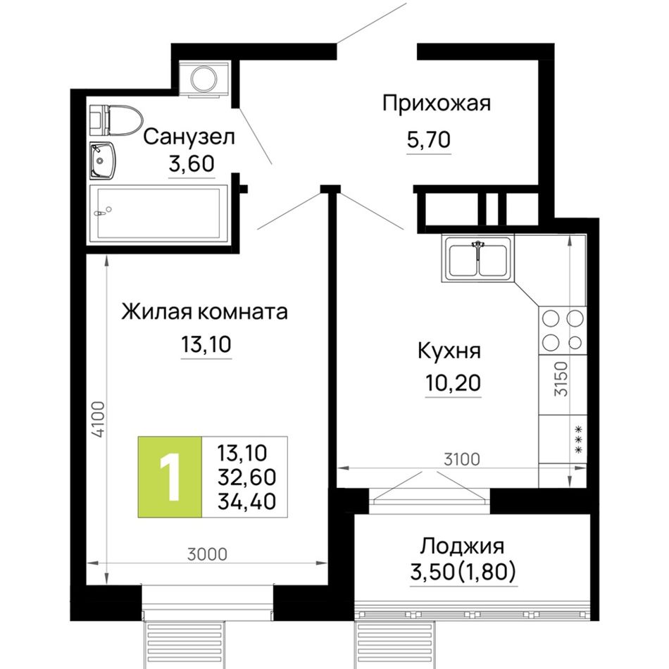 1-комнатная — 34,4 м² 2/16 эт. в Дом 101