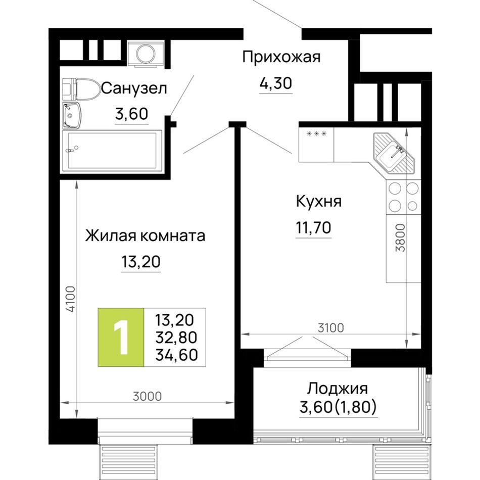 1-комнатная — 34,6 м² 2/16 эт. в Дом 101