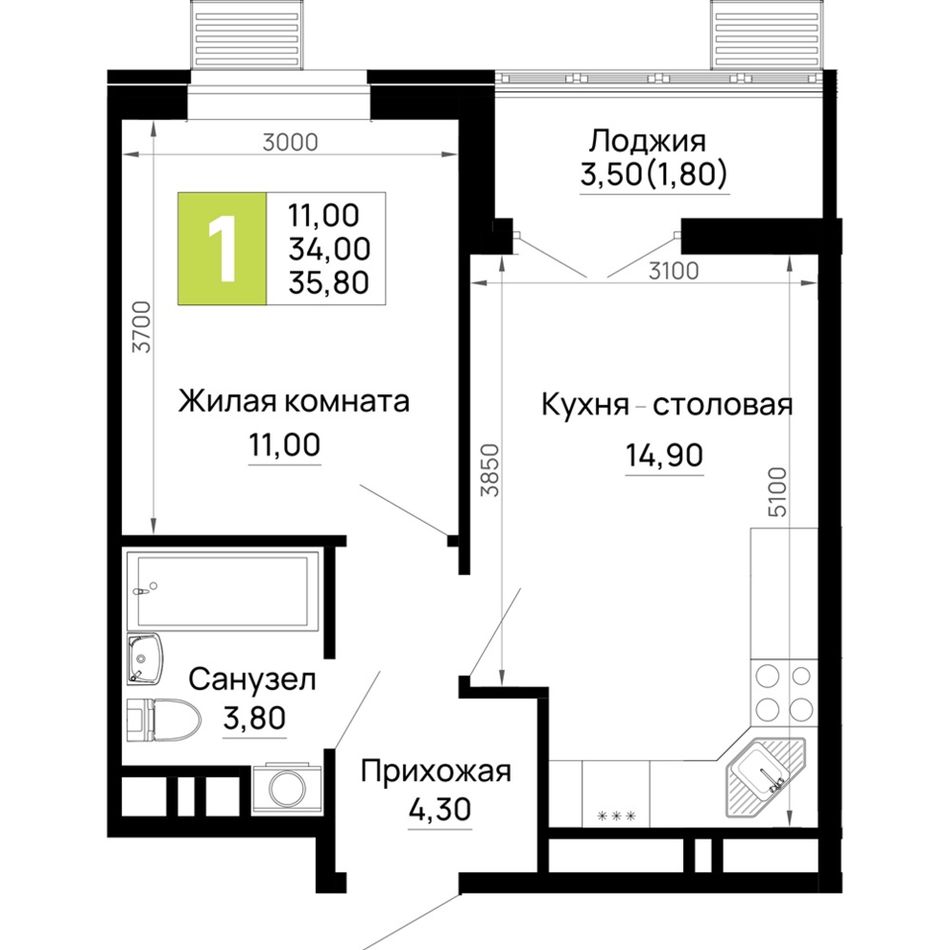1-комнатная — 35,8 м² 1/16 эт. в Дом 101