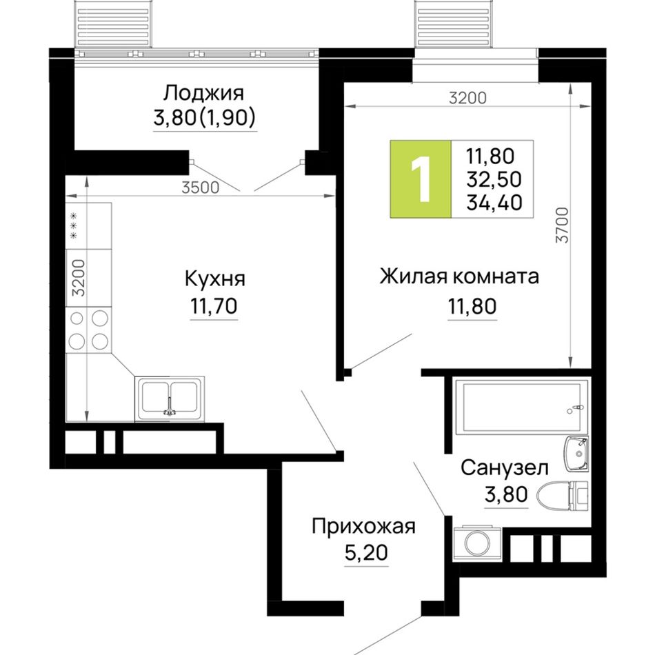 1-комнатная — 34,4 м² 1/16 эт. в Дом 101
