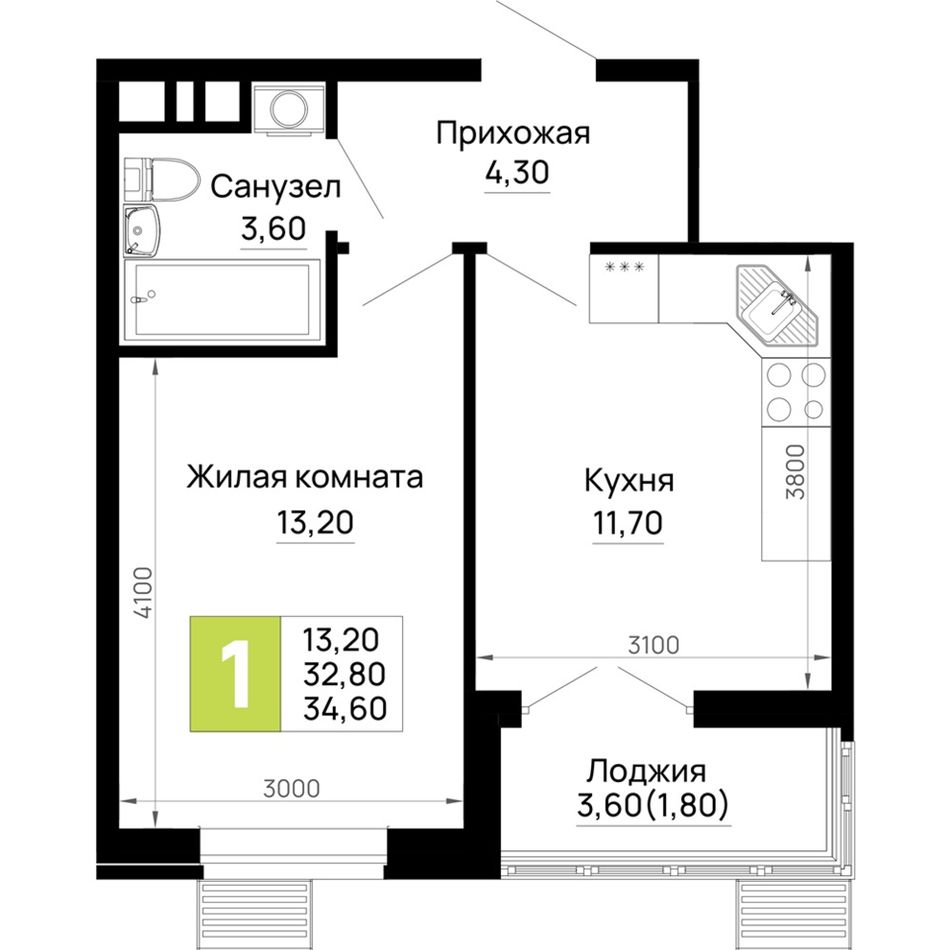 1-комнатная — 34,6 м² 1/16 эт. в Дом 101