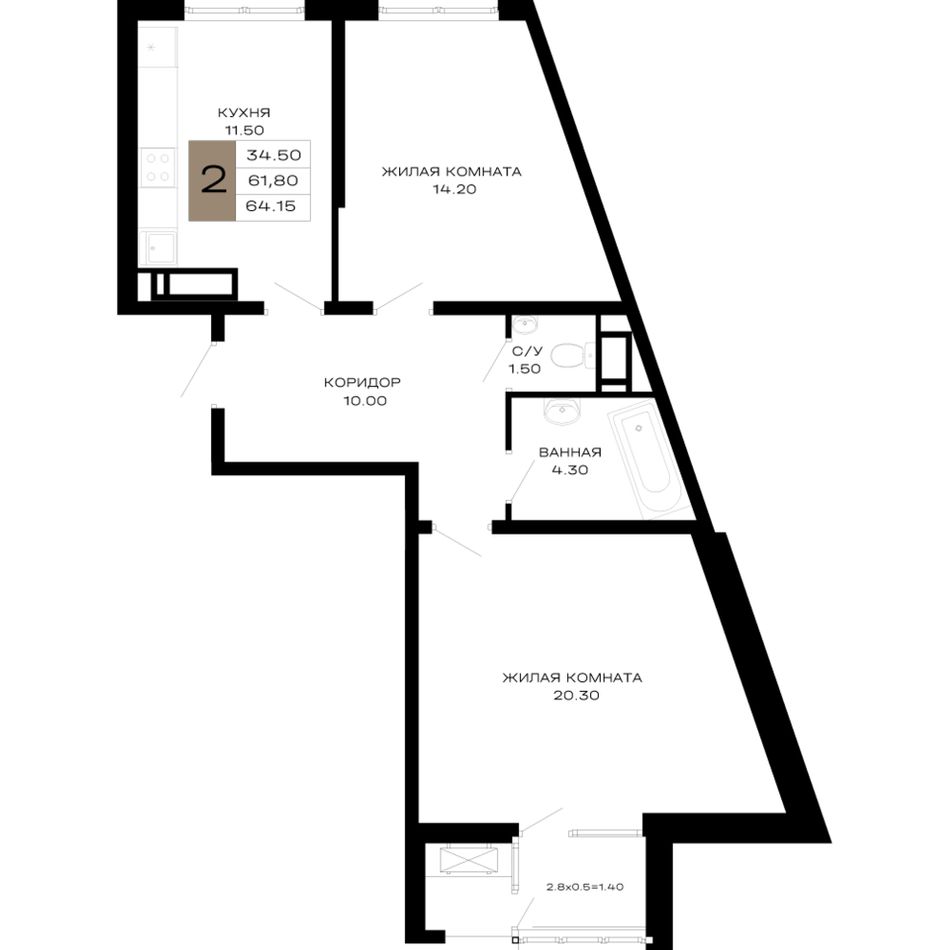 2-комнатная — 64,15 м² 8/23 эт. в Дом 101