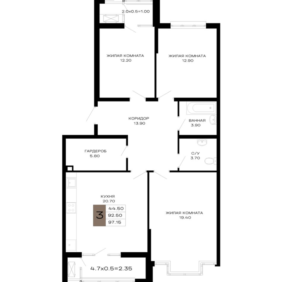 3-комнатная — 97,15 м² 3/23 эт. в Дом 101