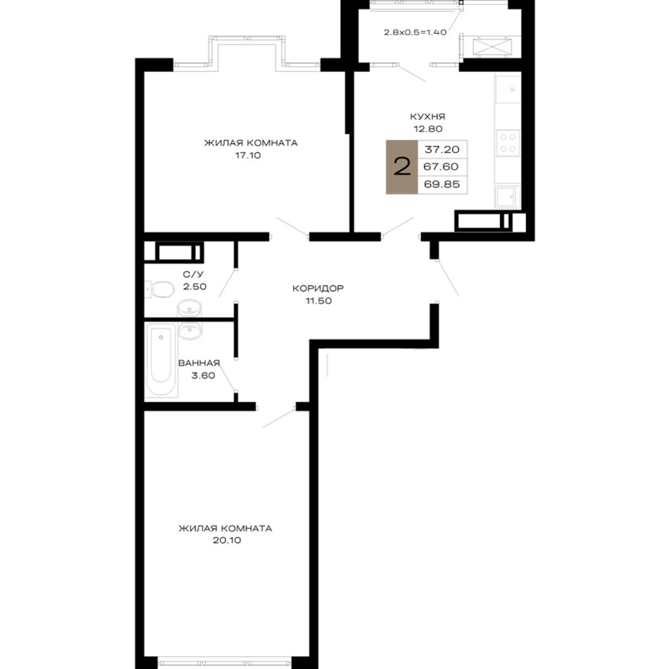 2-комнатная — 69,85 м² 6/23 эт. в Дом 101